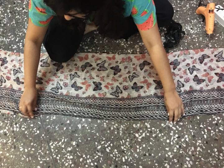 Cut the scarf into two pieces, then you will get two pieces of same size as shown in the picture below.