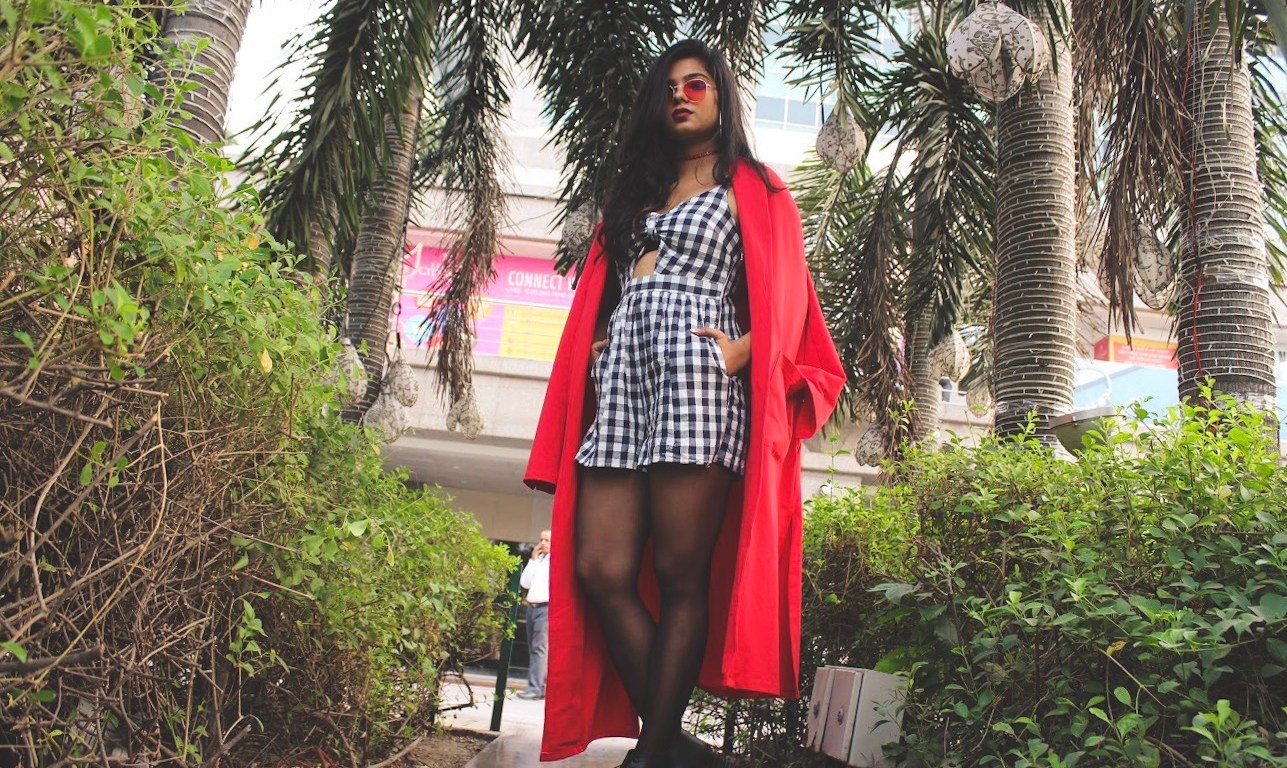 For the second look, I chose this Red Duster Coat which is absolutely gorgeous and paired it with playsuit which has gingham print all over and oh my God, I fell in love with this look. Paired them up with a pair of stockings.